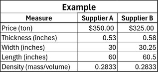 In the example below, “Supplier B” cost $1.57 per sheet or 3.3% more than “Supplier A,” even though Supplier B’s cost per pound is 7.7% lower!